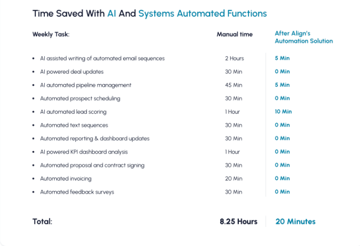 For example, our combination of AI and automated systems helps sales teams save up to 50 hours per week, and for our client The Armada, we gave their team 1 full day of productivity back each week.